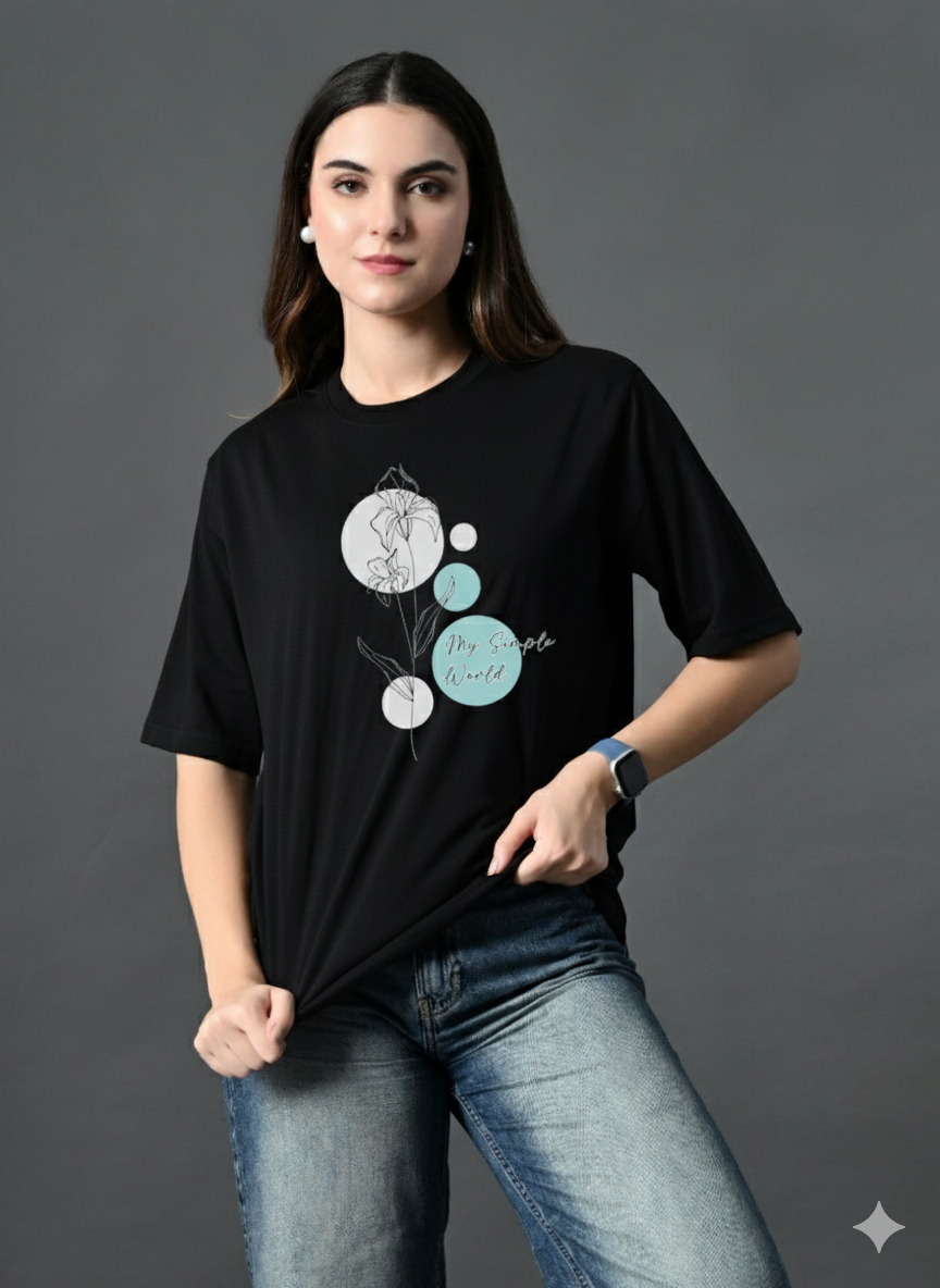 Embrace minimalism with this black t-shirt featuring a subtle floral line art graphic accented by soft grey and teal circles. The text “My Simple World” adds a peaceful, thoughtful touch.