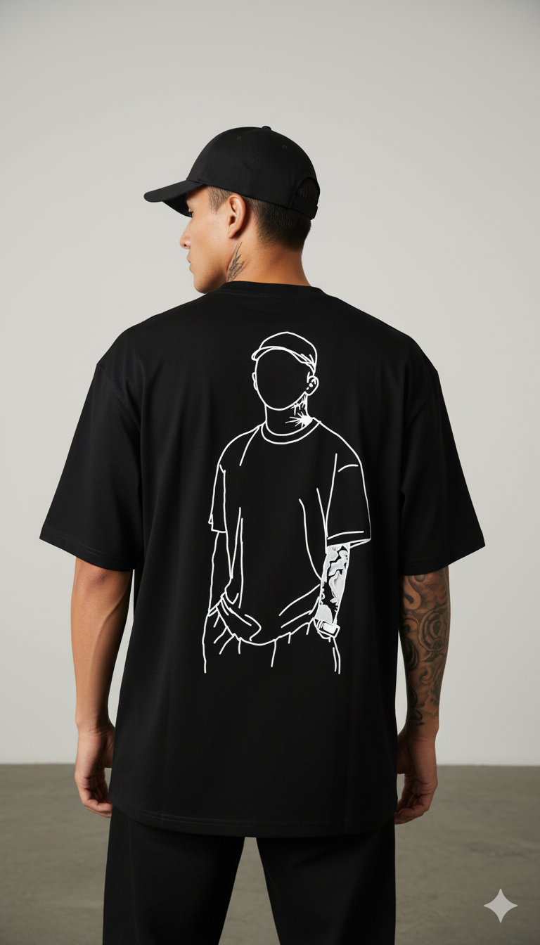 Sleek, modern, and effortlessly cool — this Black Oversized Tee features a striking minimalist white line art graphic on the back, depicting a faceless figure in relaxed streetwear style. The design symbolizes individuality and self-expression through simplicity.