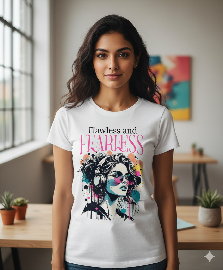 The central focus is a stunning, street-art-inspired illustration of a stylish woman wearing headphones and cool sunglasses. The artwork is alive with a vibrant, chaotic mix of neon colors (pink, blue, yellow) splattered around the image, giving it a dynamic, pop art/urban aesthetic. Above the graphic, the powerful, motivating phrase “Flawless and FEARLESS” is written in a bold, pink-to-magenta gradient font. This shirt is designed for women who embrace their strength, style, and unique energy.