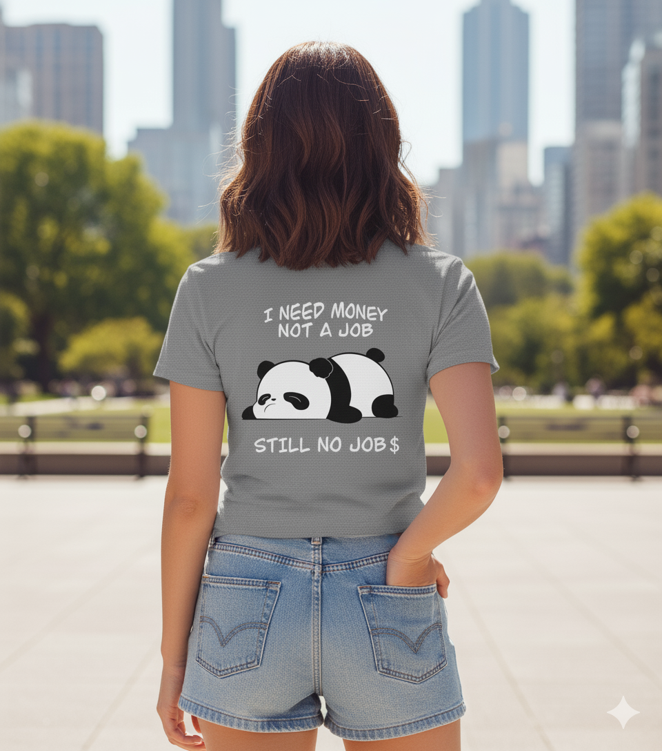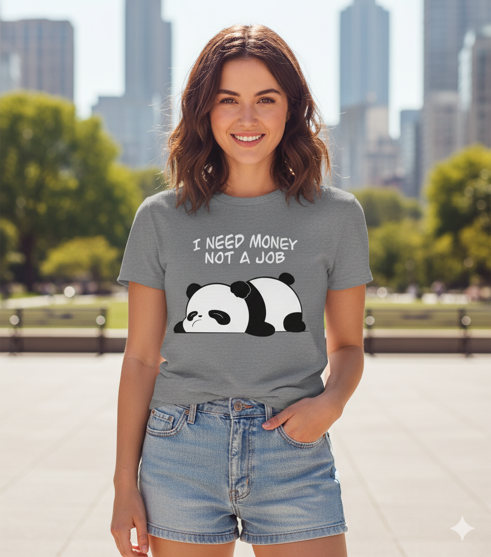 The central design features an irresistibly cute but equally lazy panda bear, sprawled out flat, looking decidedly unimpressed. Above the panda, the universally relatable and slightly sarcastic quote “I NEED MONEY NOT A JOB” is printed in a clean, bold font. This shirt is a hit with students, remote workers, tired professionals, and anyone who appreciates a good, funny statement piece.