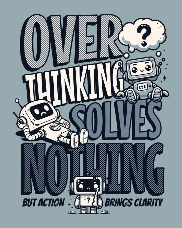 The back design features a bold motivational quote — “Overthinking Solves Nothing, But Action Brings Clarity” — paired with playful cartoon robots that add a modern, creative twist.