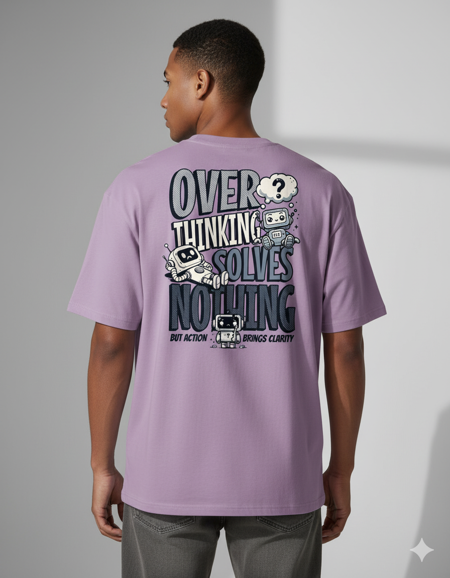 Stay inspired with this lavender oversized t-shirt featuring the quote “Overthinking Solves Nothing” and a fun robot graphic. A perfect blend of motivation and streetwear style for everyday wear.