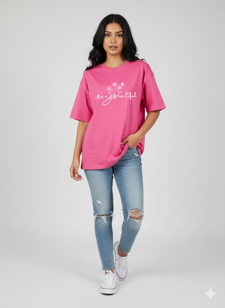 Tags: aesthetic tee, beyoutiful, bubblegum pink, butterfly, casual top, comfort wear, empowering tee, floral print, Graphic Tee, Inspirational, Motivational, oversized, Pink T-shirt, positive vibes, script font, self love, unique beauty