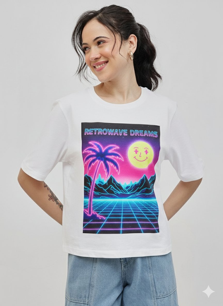 Step back into the vibrant, electric glow of the 1980s with our Retrowave Dreams T-Shirt. This eye-catching white crop tee is a must-have for anyone who loves the synthwave, vaporwave, or outrun aesthetic.