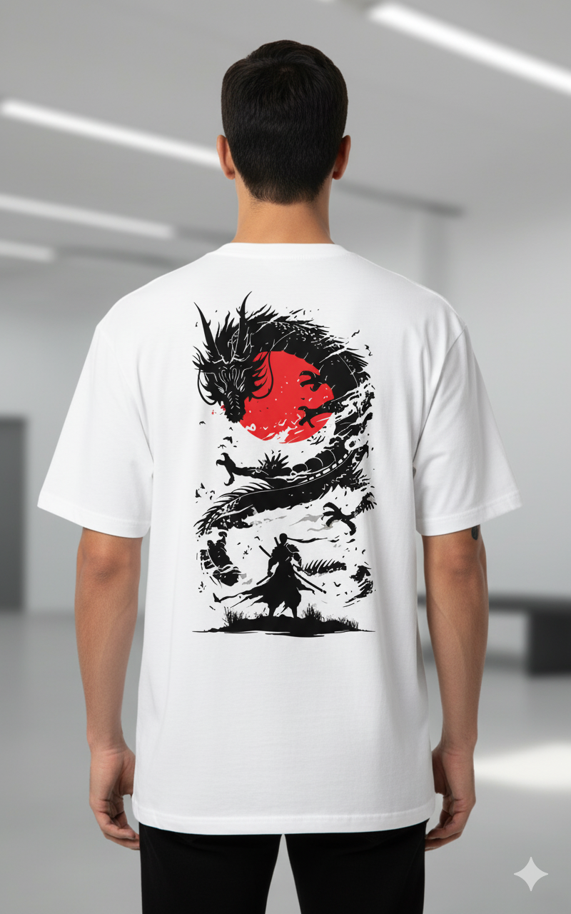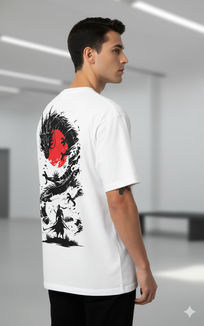 Channel the spirit of ancient Japan with our white “Samurai and Dragon” graphic T-shirt, featuring a stunning black-and-red illustration of a warrior facing a powerful dragon under a crimson sun. Designed for streetwear lovers and art enthusiasts alike, this bold print symbolizes strength, honor, and courage.